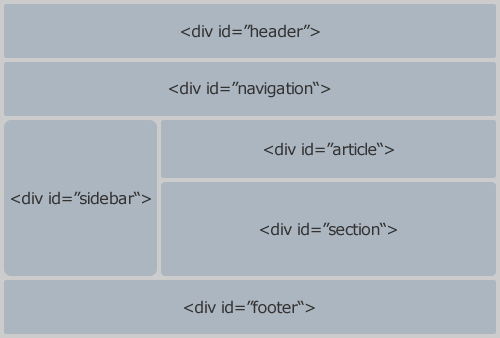 header - заглавна част, обикновено съдържа лого и евентуално навигацияhgroup - група от заглавие, подзаглавие и тнfooter - завършваща част, обикновено съдържа © и другиaside - странична част, съдържаща реклами и неща, свързани с основния материалnav - навигацияmain - основното съдържание на страницата - не трябва да съдържа елементи, налични в други страници като менютаarticle - елемент, съдържащ информация, самостоятелно обособена, която може да бъде извадена от контекста на страницата и да не губи своя смисъл. Обикновено има header и евентуално footersection - елемент, който обособява секция от страницата. По стандарт се счита, че трябва всяка секция трябва да има заглавиеfigure - контейнер за картинка (още позната като фигура), очаква се да съдържа figcaptionfigcaption - име или коментар към картинкатаembed, video, source, audio, track, canvas, svg - caniuse.com